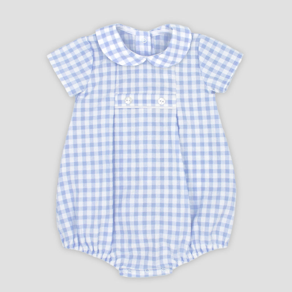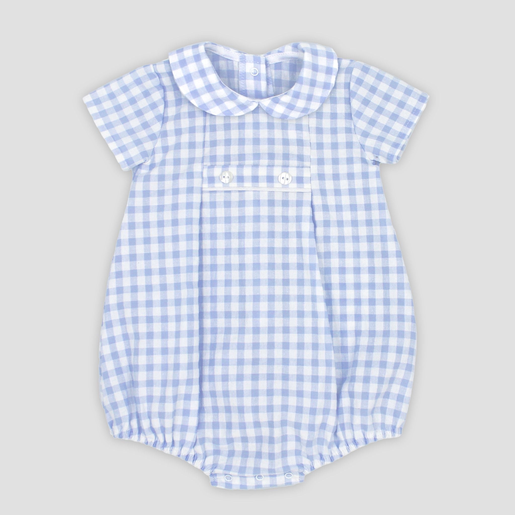 A sweet and classic baby bloomer crafted in soft blue and white gingham. Features decorative front buttons for a timeless look. Perfect for everyday wear or special occasions.