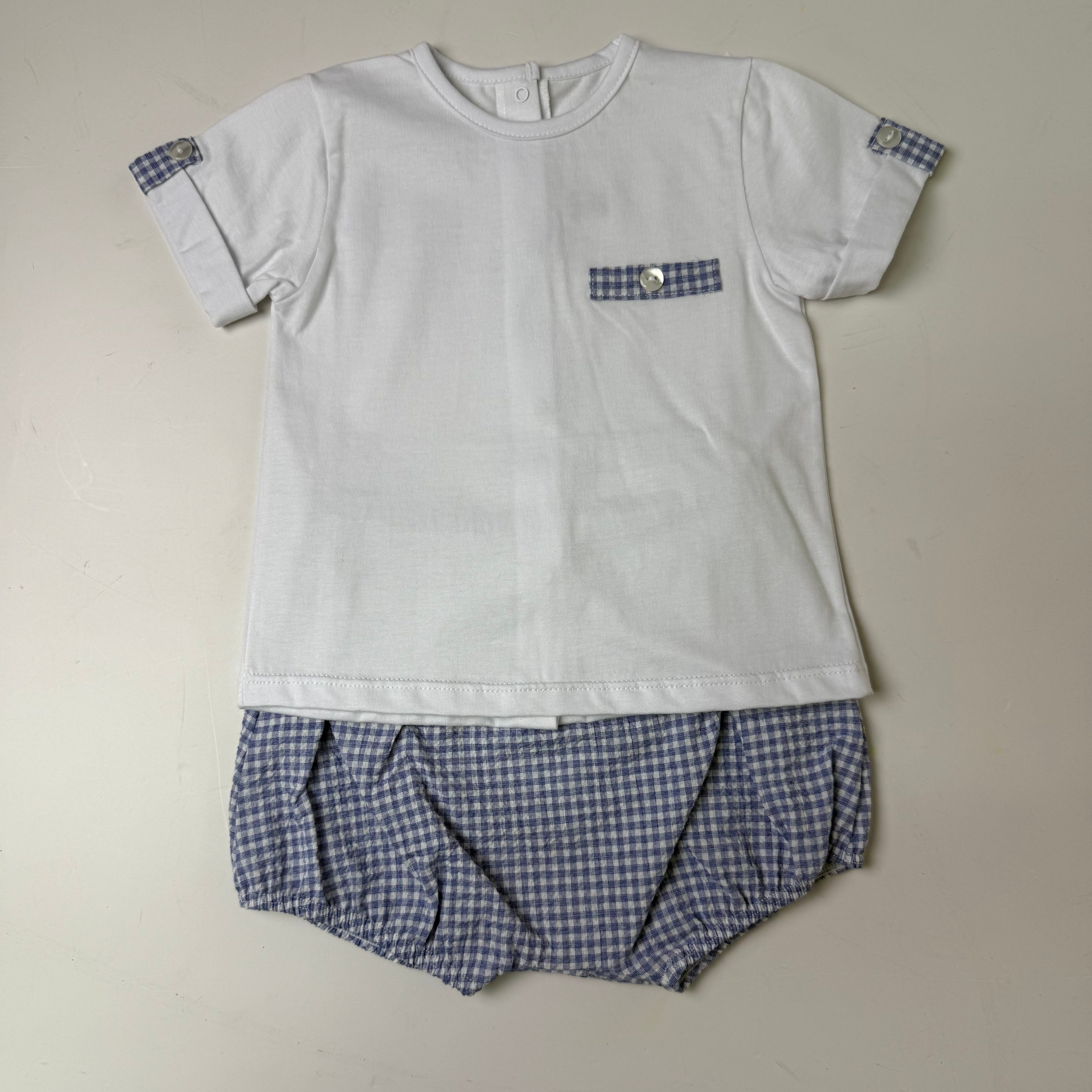 This classic and elegant set is perfect for your baby’s comfort and style. The bloomers, made from soft gingham blue and white fabric, offer a fresh and delicate design ideal for everyday wear. The white top, with a small chest pocket, adds a charming and practical touch.