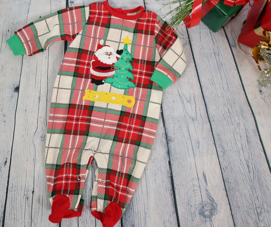 Baby romper in a plaid print featuring a charming embroidered Santa with a Christmas tree. Perfect for holiday photos and matching Christmas pajamas for the whole family. An exclusive style from our store.