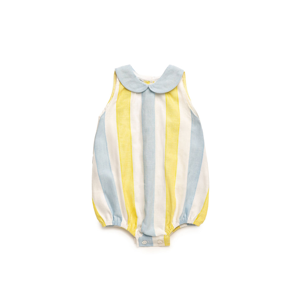 "Charming Spanish bloomer set with a Peter Pan collar, featuring yellow and blue stripes to match the baby dress in the same fabric. Designed with convenient snap buttons at the crotch for easy changing."