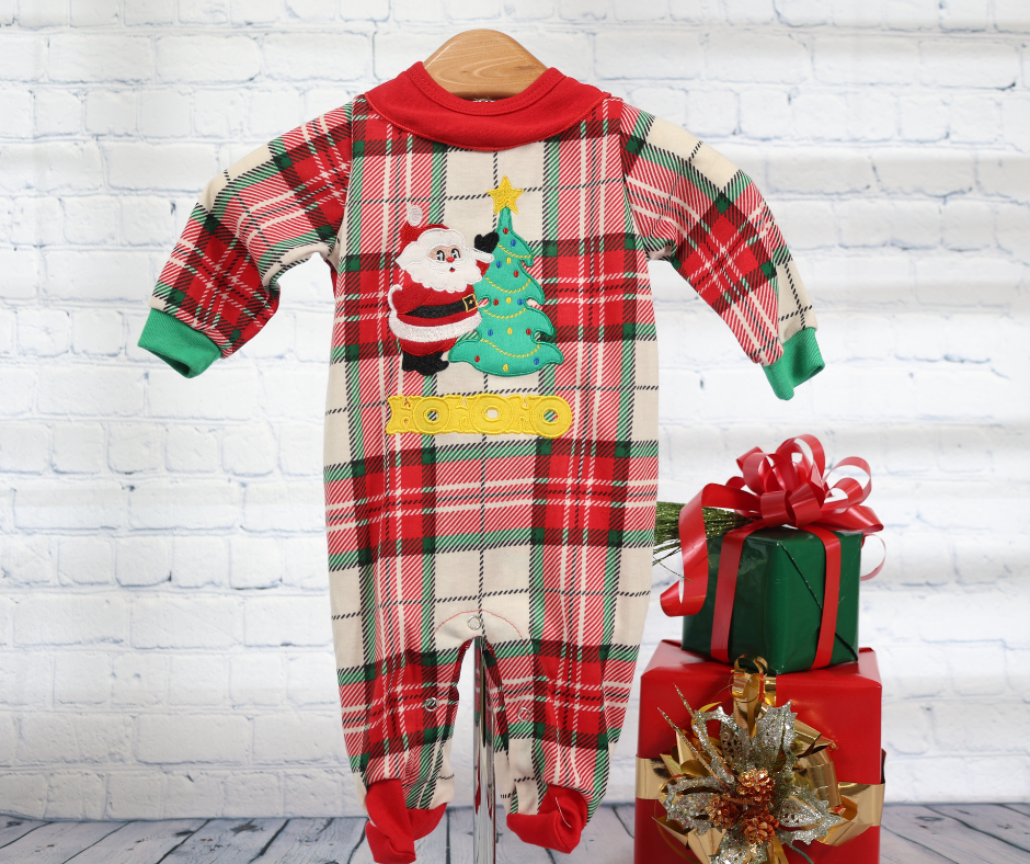 Baby girl romper in a plaid print featuring a charming embroidered Santa with a Christmas tree. Perfect for holiday photos and matching Christmas pajamas for the whole family. An exclusive style from our store.