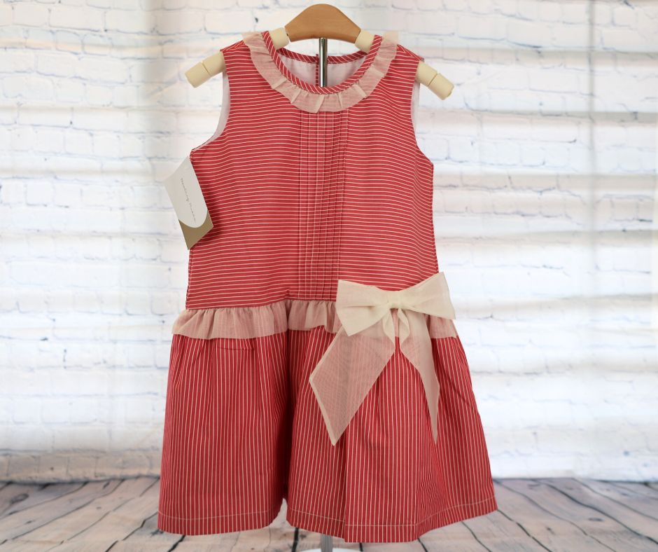 This elegant long-waisted red dress features delicate pinstripes, a charming organza bow on the skirt, and a soft ruffled neckline. Perfect for holiday photos, Christmas celebrations, and end-of-year festivities.