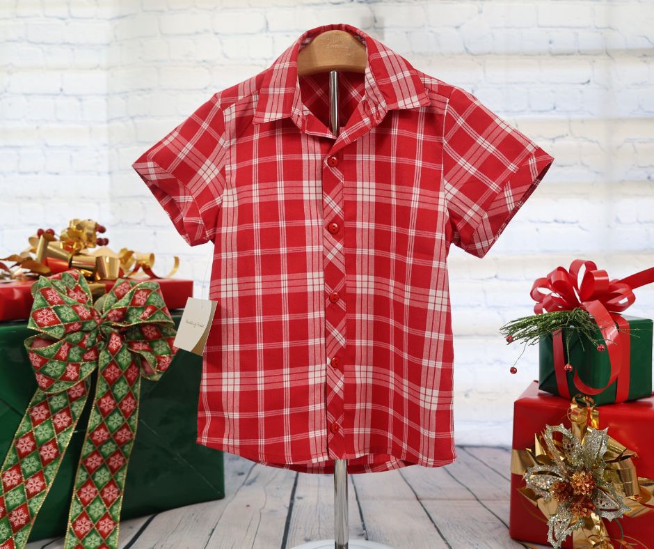 100% cotton shirt in red and white checks, short sleeves, matching with sibling styles in the same fabric. Perfect for the holiday season or family photos.