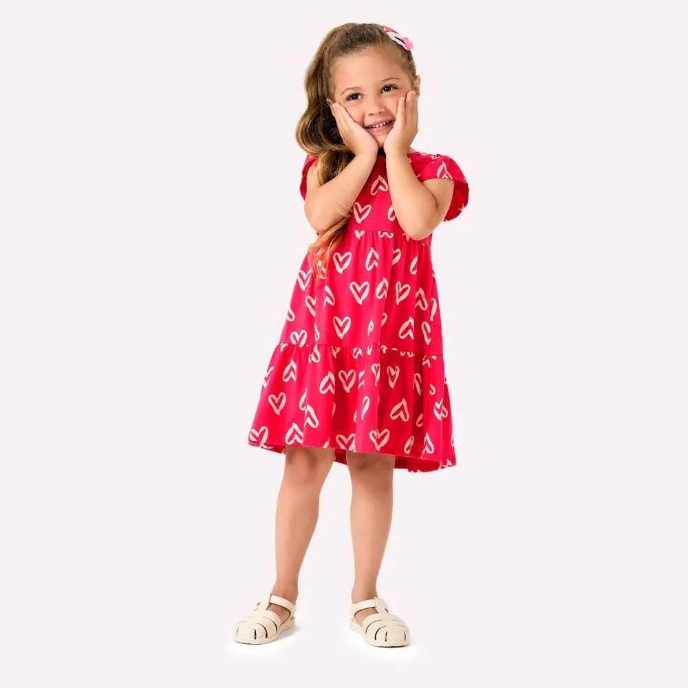 Cotton knit dress with modern heart print, ruffled skirt, and shoulder detail. Versatile and comfortable for any occasion — the perfect little gift when you need something special."
