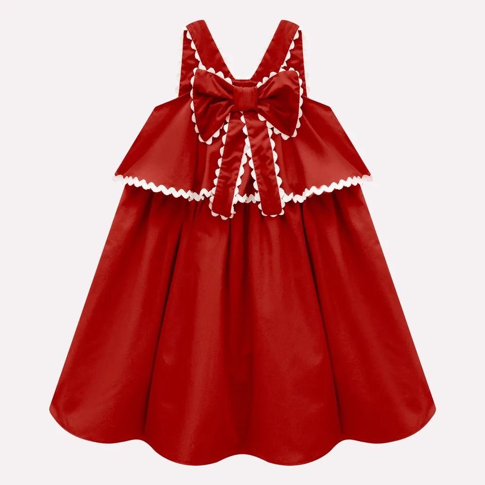 Red poplin dress crafted from 100% cotton, featuring a refined front bow that adds a touch of timeless grace. Its crisp silhouette and exquisite detailing make it the perfect choice for end-of-year celebrations and other memorable occasions.”