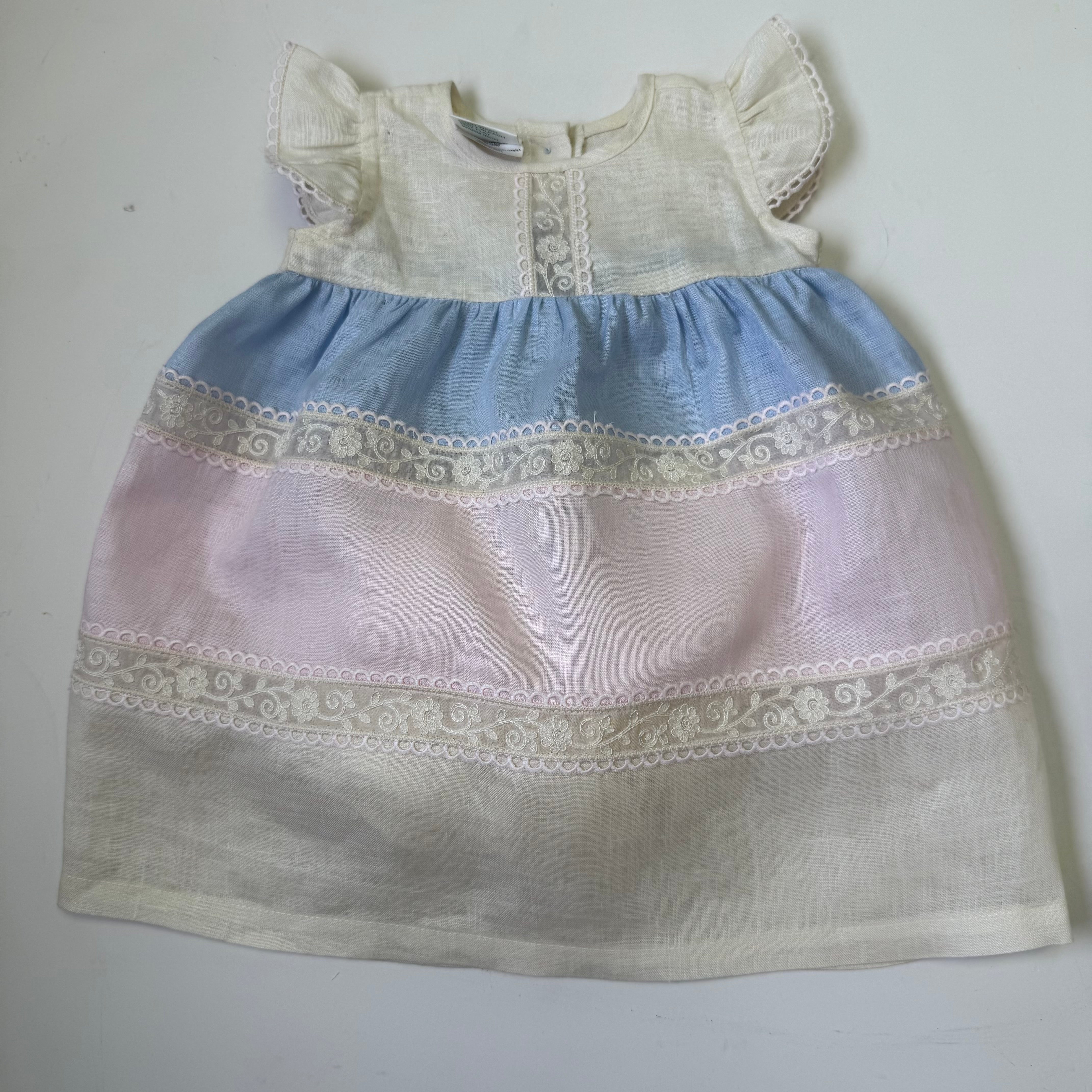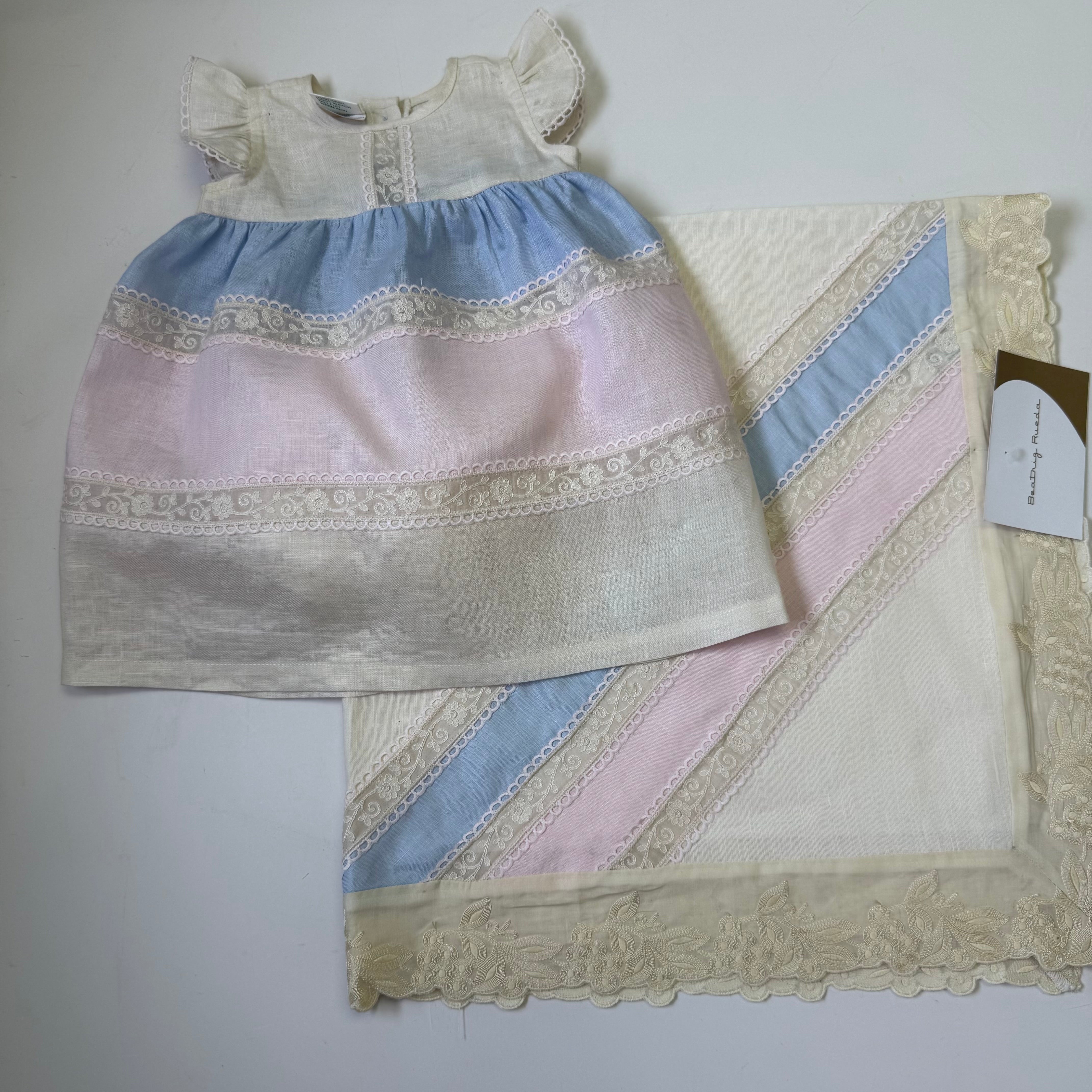 Set of blanket  dress  and bloomers in three tones of 100% linen,with delicate lace all around. Perfect for bringing your baby home from the hospital, capturing her first photos, and creating a special keepsake of these unforgettable days.