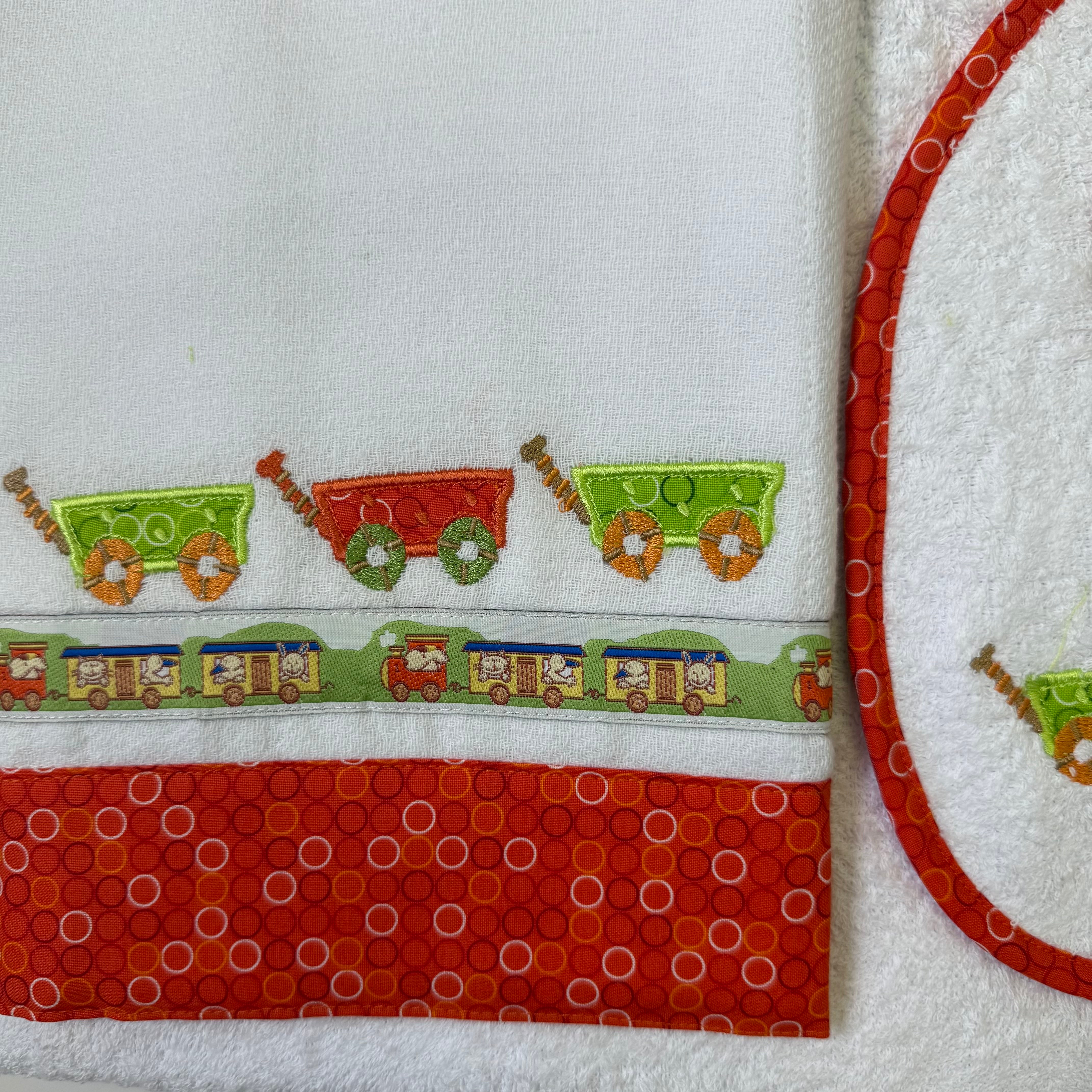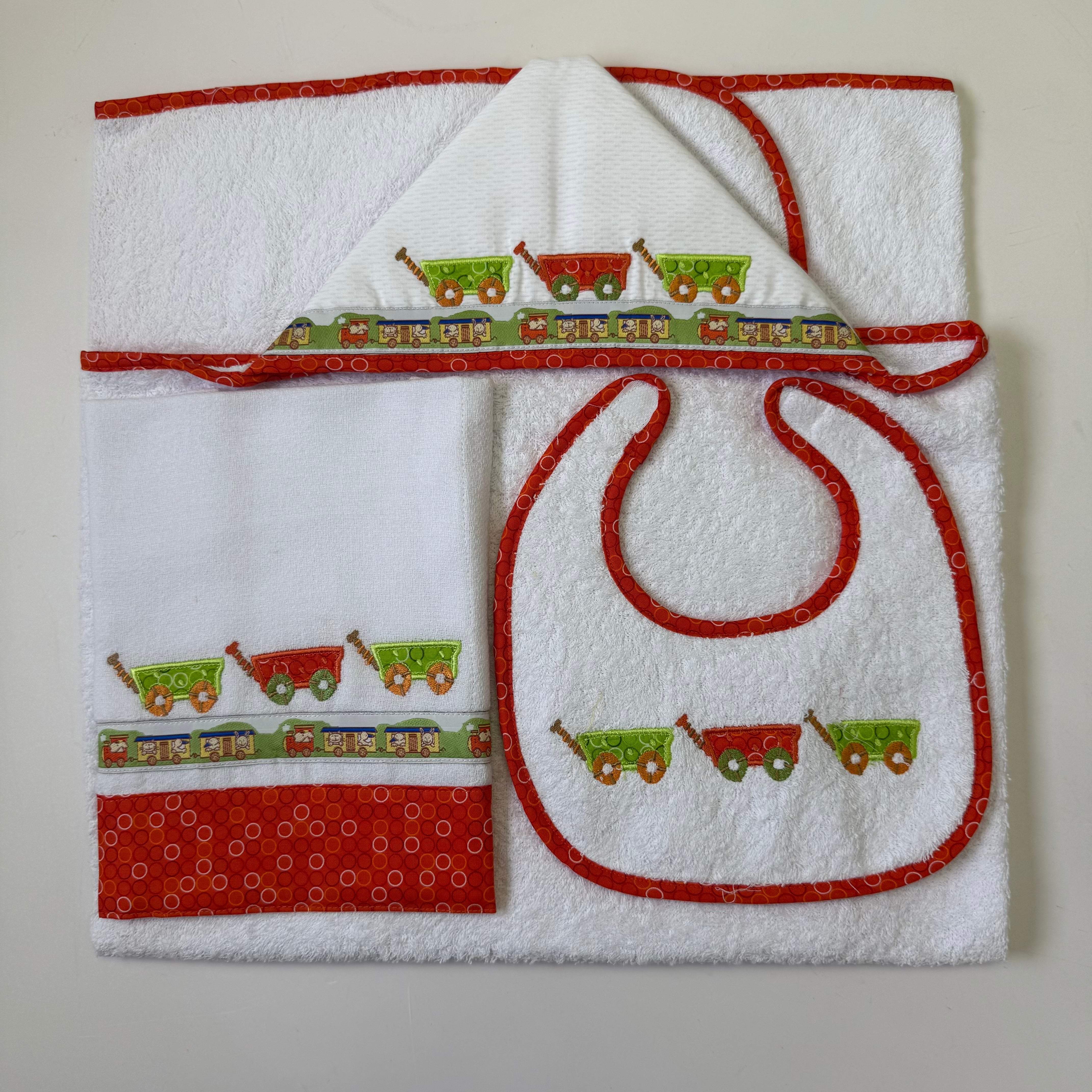 Soft and absorbent towel set made of 100% cotton, featuring a charming wagon embroidery i. Includes matching burp cloth and bib with the same design. The towel is generously sized, making it perfect for your little one to use for years to come. A beautiful gift for a newborn or baby shower.