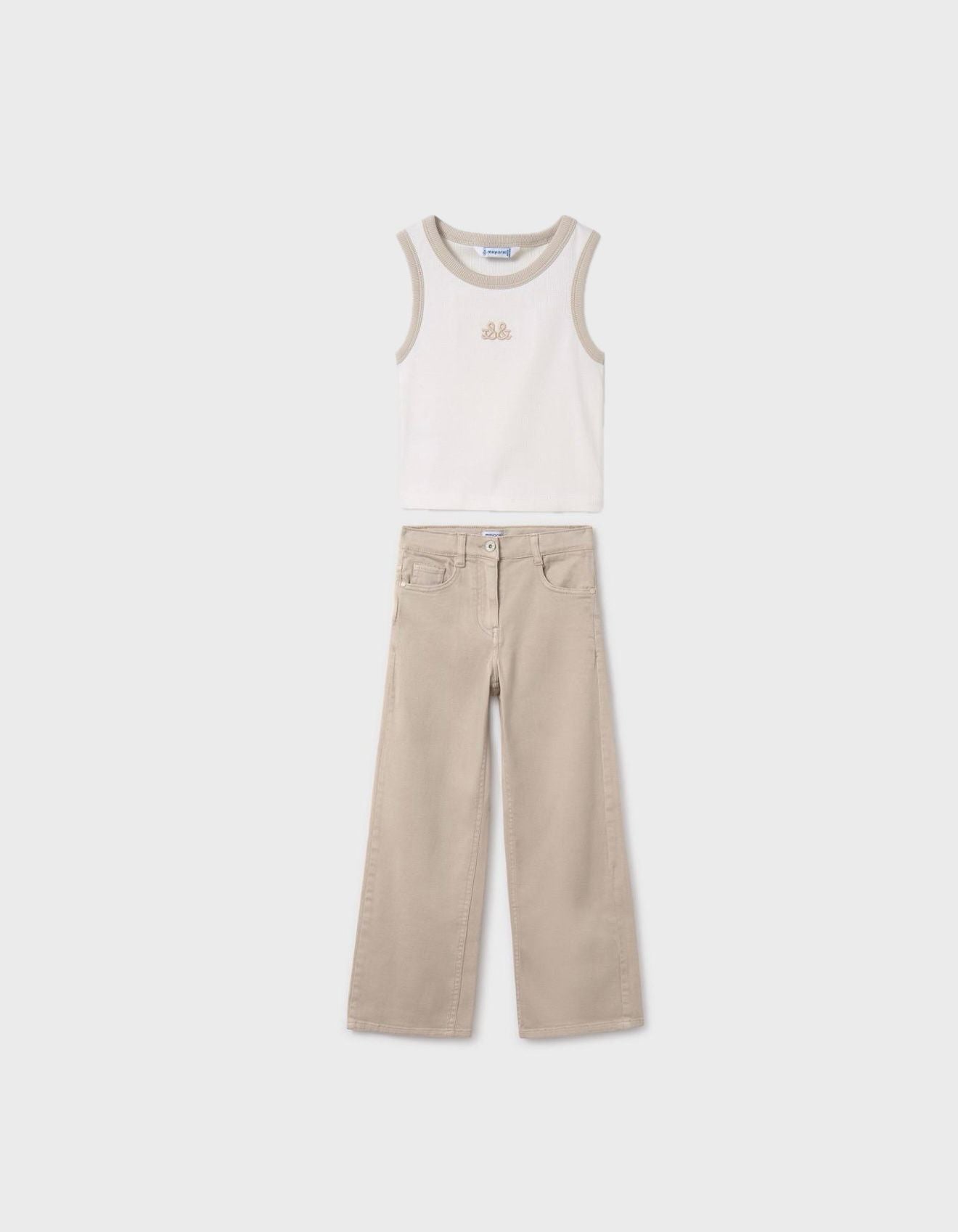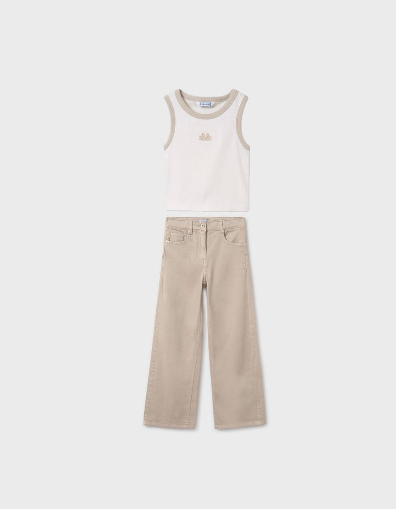 This stylish set features wide-leg twill pants paired with a chic beige cropped top, both accented with matching gold details for a coordinated, fashion-forward look. Designed for older girls who love modern, effortless style, this outfit is perfect for standing out with confidence and comfort. Ideal for casual outings, special events, or whenever they want to feel sophisticated and cool.