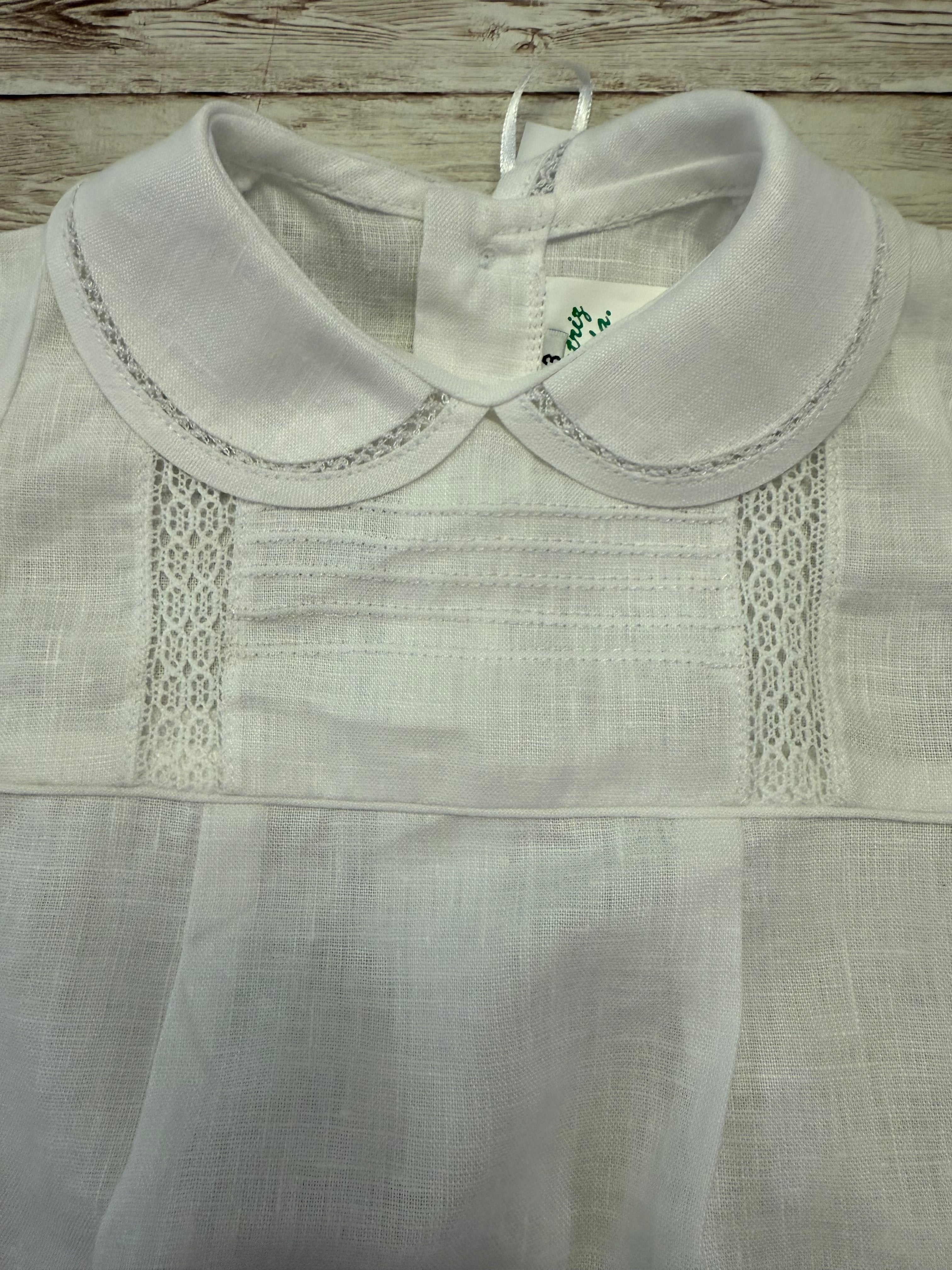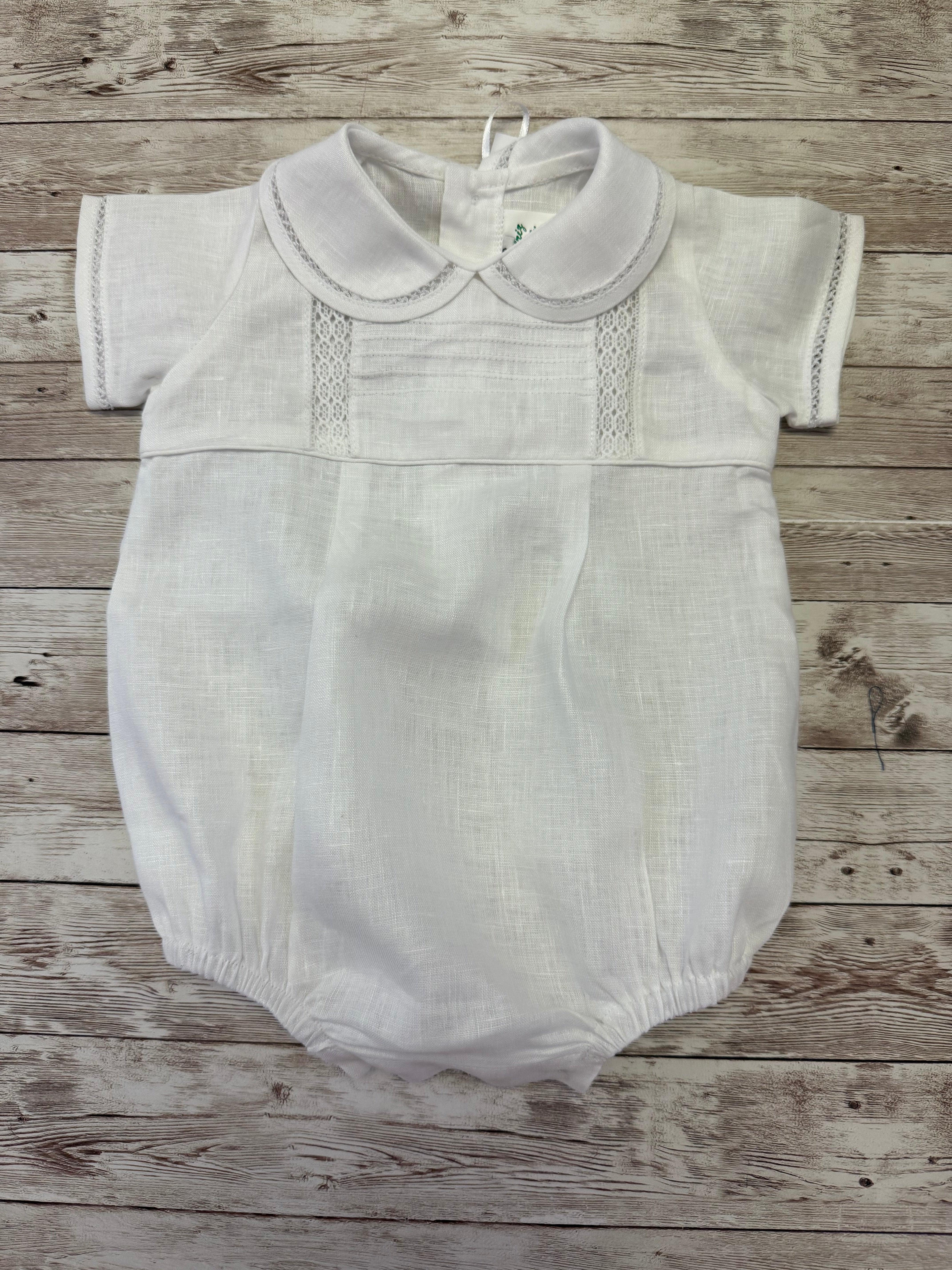 Linen romper with pintucks and lace details on the chest, featuring delicate picot trim on the collar and sleeves. Elastic at the legs and buttons at the crotch make changing easy. A classic and elegant piece, perfect for any special occasion.