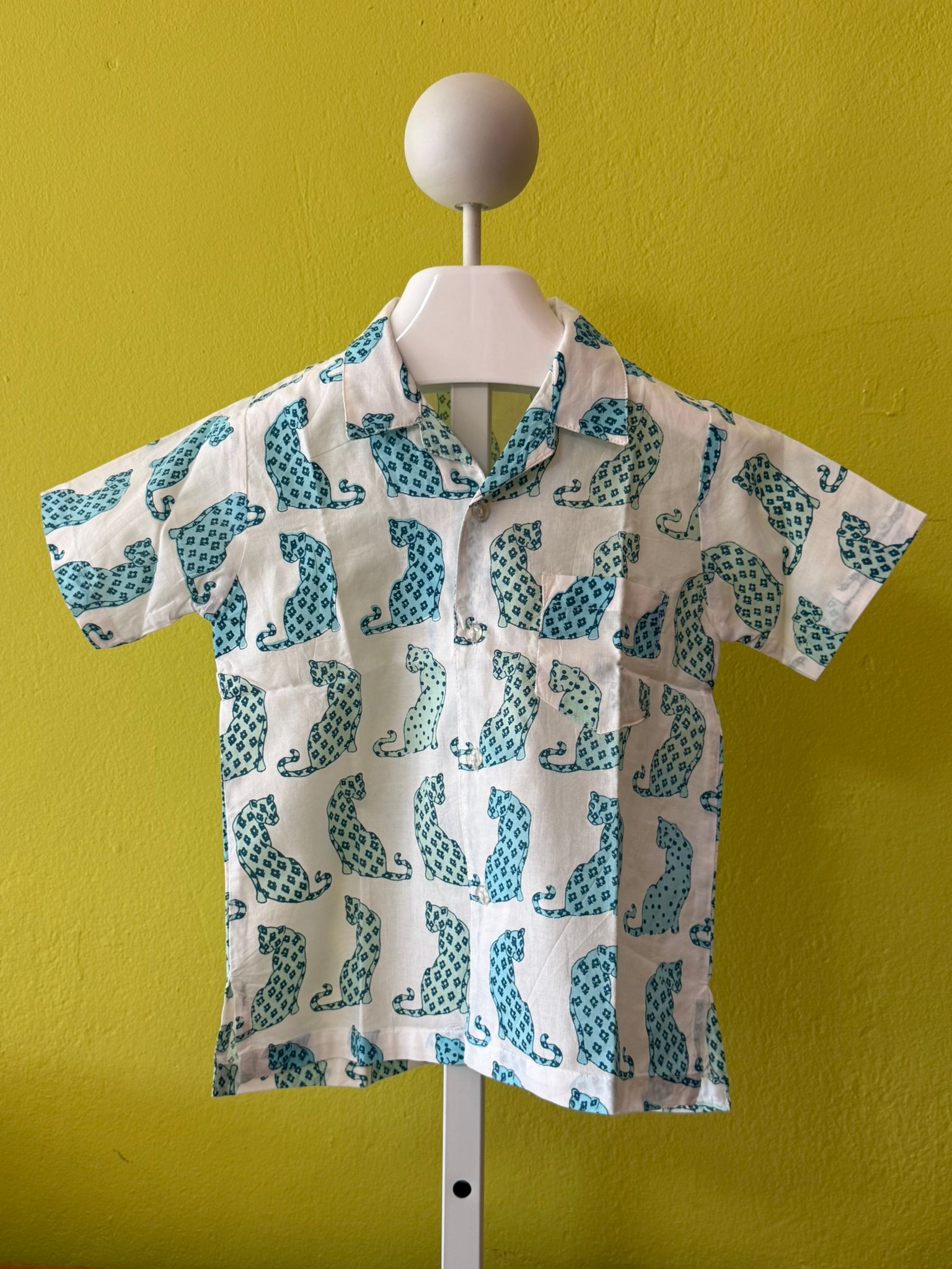 Cotton shirt with a playful panther print, easy to pair with any shorts or jeans. Perfect for matching with the sister’s dress and the overall for siblings to coordinate in style."