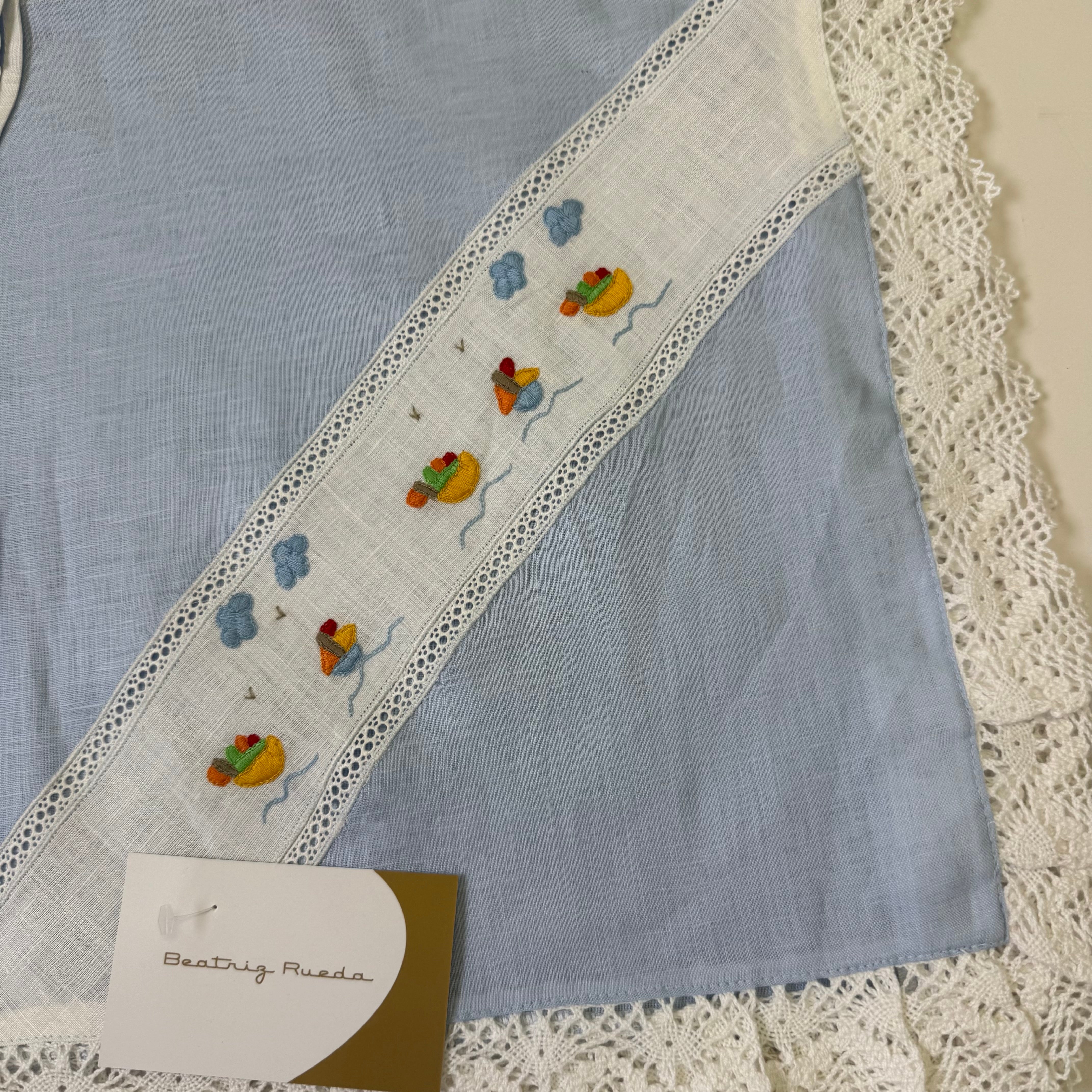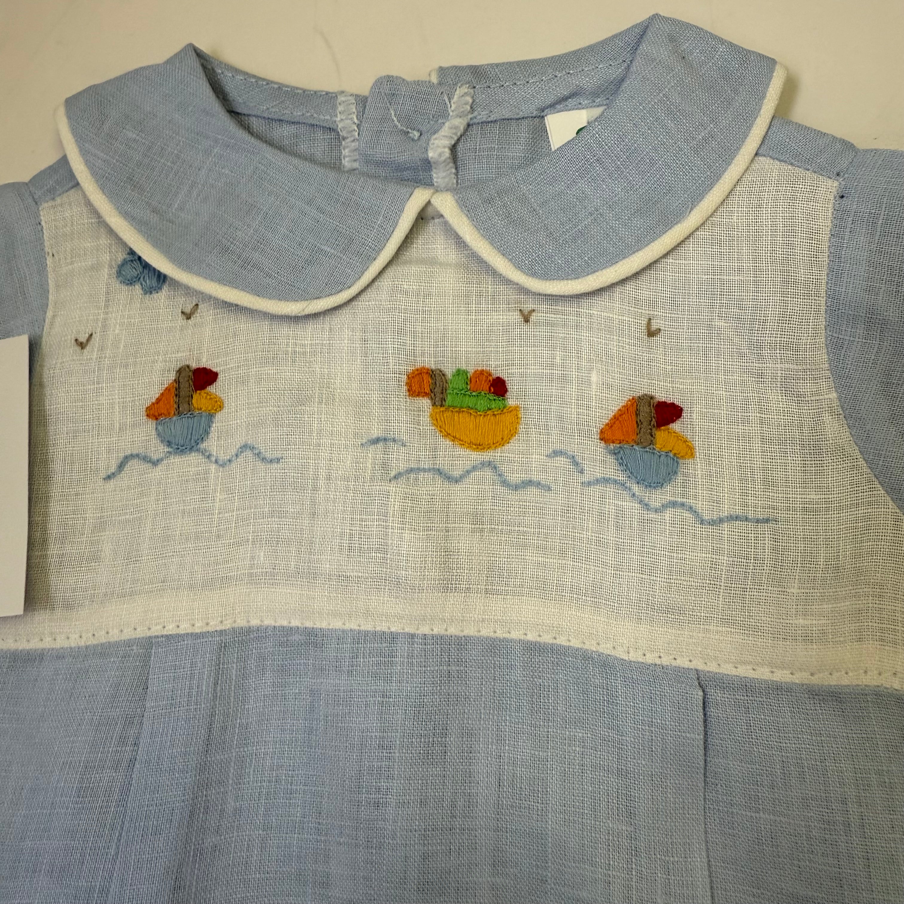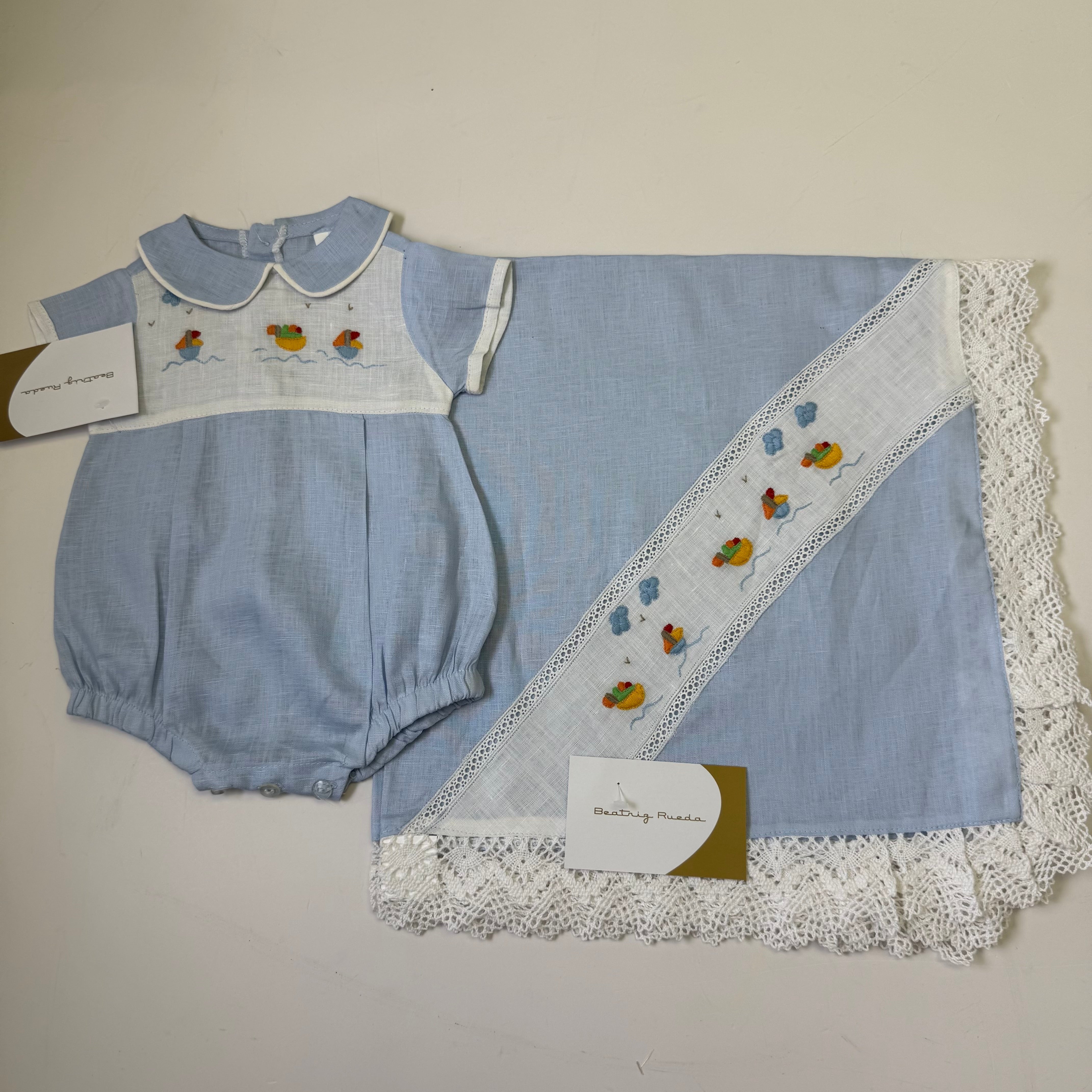 Set of blanket and romper featuring hand-embroidered sailboats, delicately stitched on both the blanket and the bloomer. A timeless and charming design, perfect for welcoming your baby or as a special gift.