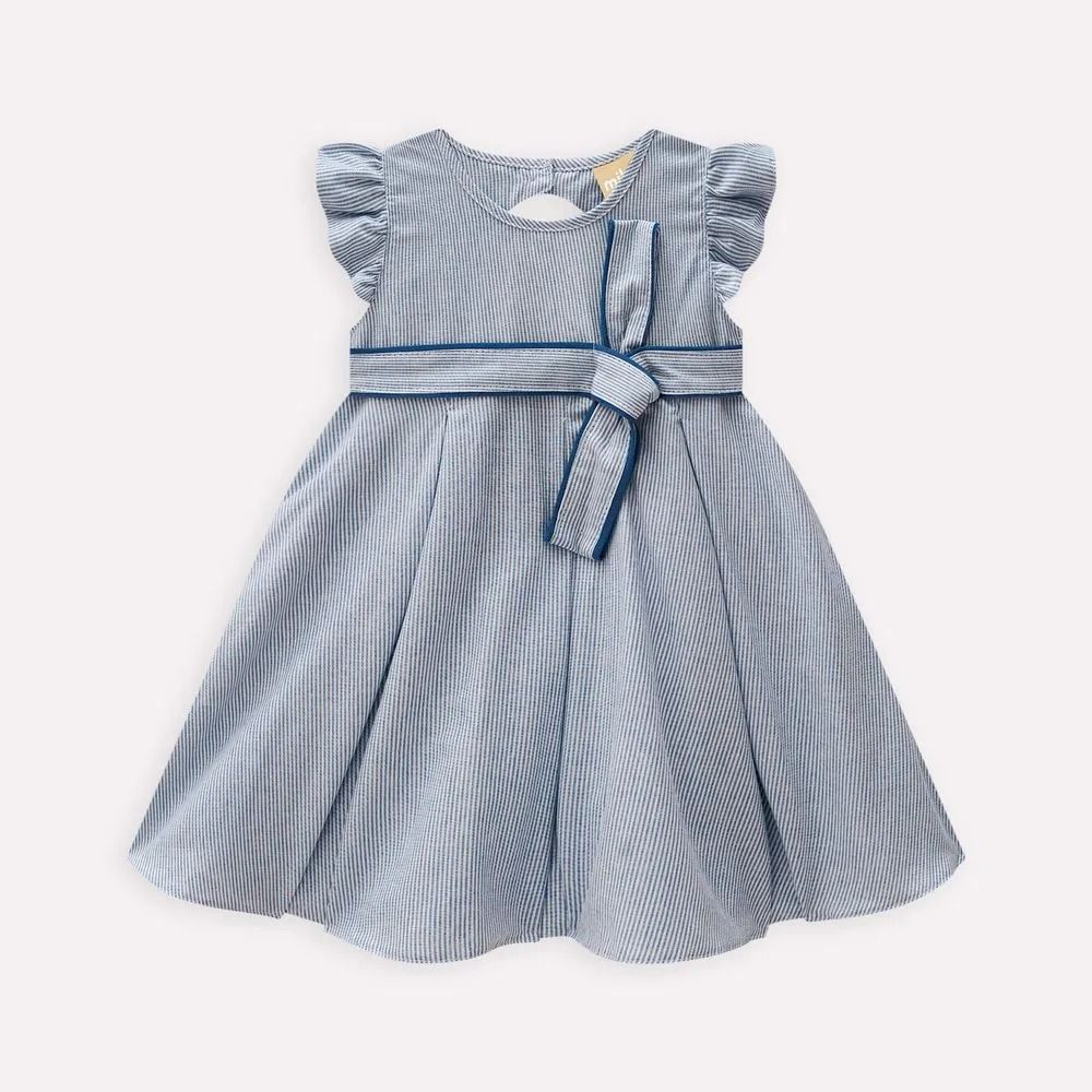 Charming cotton dress with a front knot and open back, featuring delicate ruffled sleeves. Perfect for special occasions where your little one can shine.”