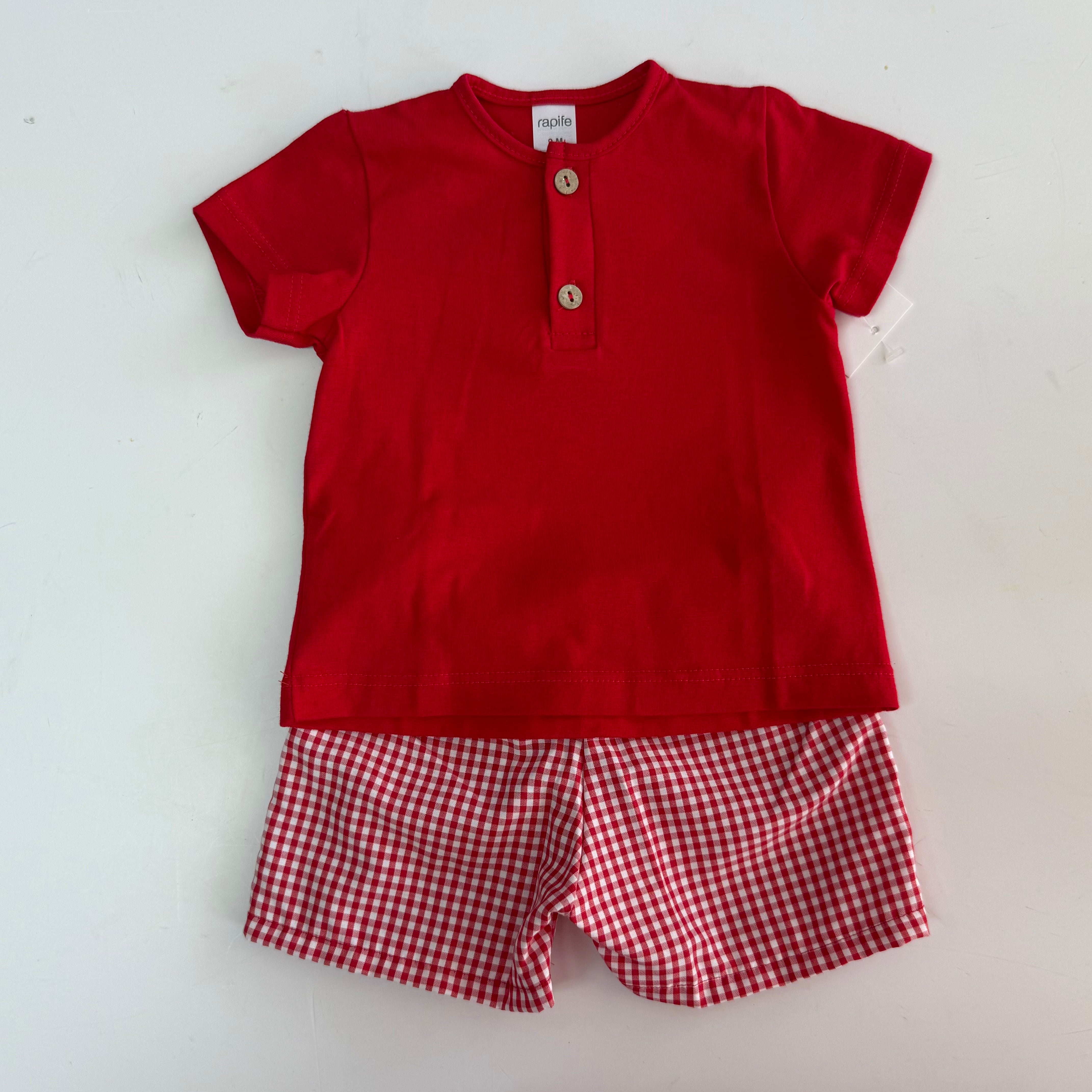 This classic boys’ outfit includes red gingham shorts paired with a soft red cotton knit t-shirt featuring front buttons for a polished look. Comfortable and versatile, it’s perfect for everyday wear or festive holiday photos.