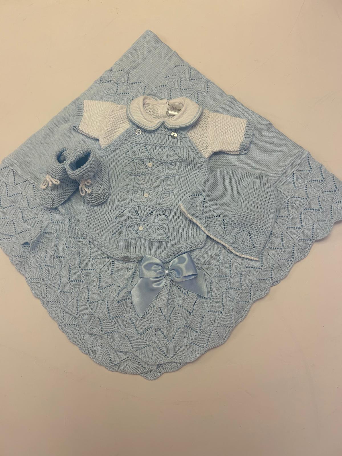 Beautifully crafted cotton knited baby set, designed for your baby’s first days. This set includes a short knit onesie with matching booties, a coordinating hat, and a generously sized blanket finished with delicate knitted edging.