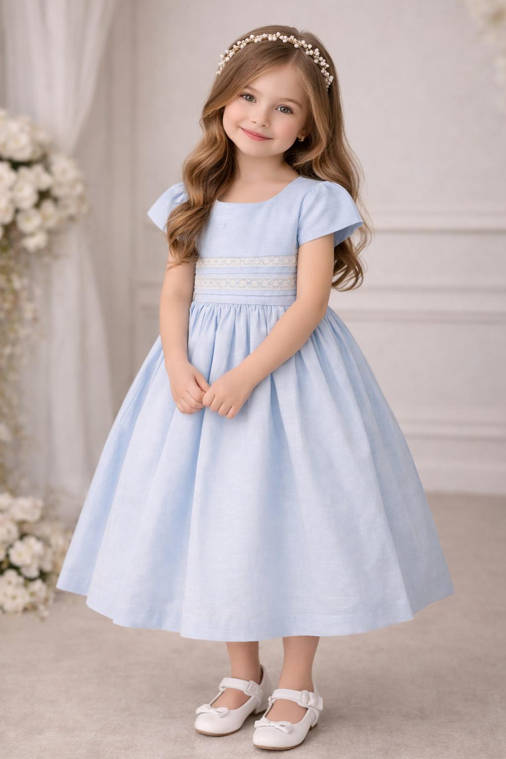 A timeless classic dress every mom loves to dress her little girl in. Made from a soft linen-cotton blend, it features delicate pintucks on the bodice with elegant Valenciennes lace inserts and short sleeves. This charming piece is perfect for graduations or as a beautiful outfit for sisters attending a First Communion. A refined and graceful choice for any special occasion.