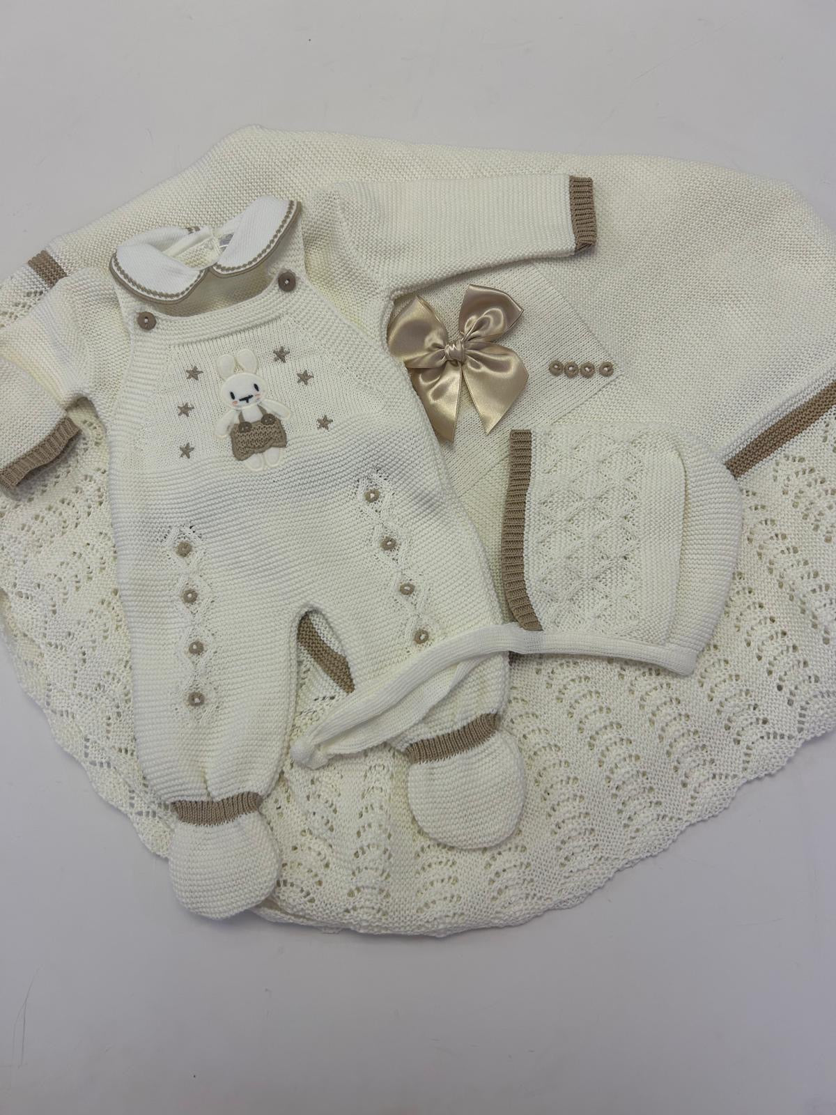 Beautifully crafted set made from fine Portuguese cotton. It includes a generously sized sheet with delicate openwork detailing along the edges and an embroidered bunny motif. Presented in an elegant ivory tone with subtle taupe accents. Ideal for bringing baby home from the hospital or for the first days of life.