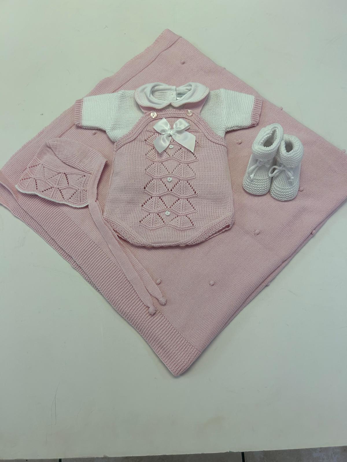 Beautifully crafted cotton knited baby set, designed for your baby’s first days. This set includes a short knit onesie with matching booties, a coordinating hat, and a generously sized blanket finished with delicate knitted edging.