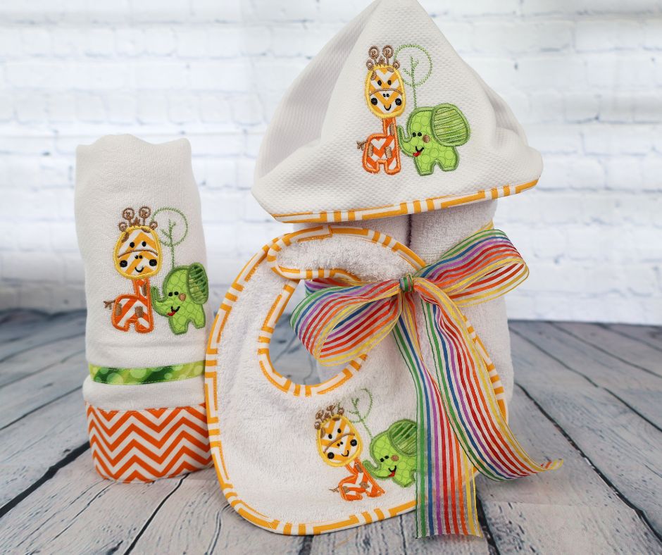A charming 100% cotton towel set, complete with a matching burp and bib, all adorned with the same sweet elephant and giraffe embroidery in bights colors.