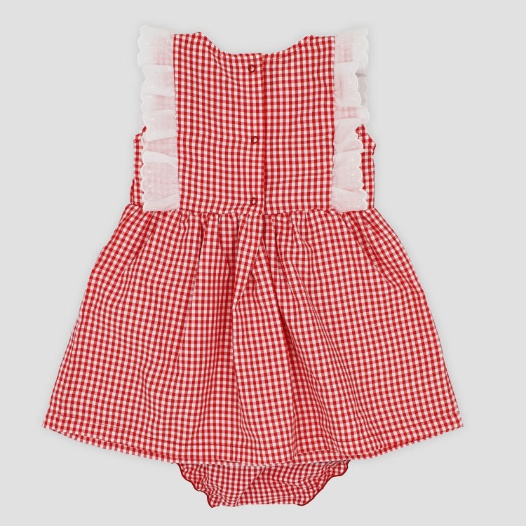 This charming dress features classic red and white gingham, beautifully accented with delicate lace on the bodice and a matching fabric bow in the front.