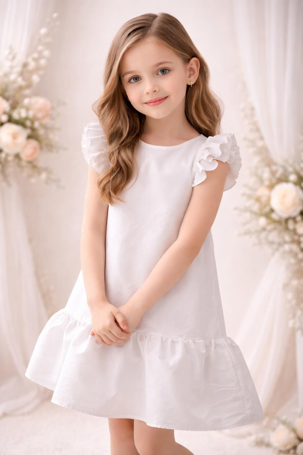 Dress with a long waistline cut, featuring a flounced hem and a pressed ruffle detail on the shoulder. This modern design is one that girls will love. Perfect for graduations, end-of-school celebrations, First Communion, and other special occasions. A stylish and charming choice for memorable moments.