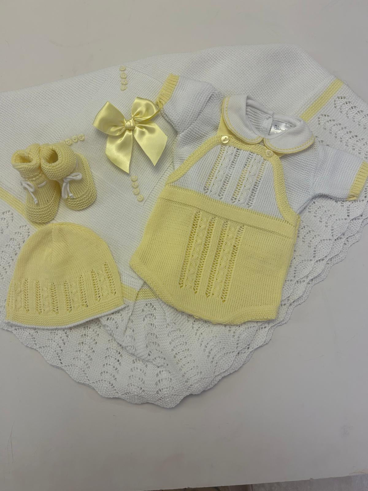 Beautifully crafted cotton knit baby set, designed for your baby’s first days. This set includes a short knit onesie with matching booties, a coordinating hat, and a generously sized blanket finished with delicate knitted edging.