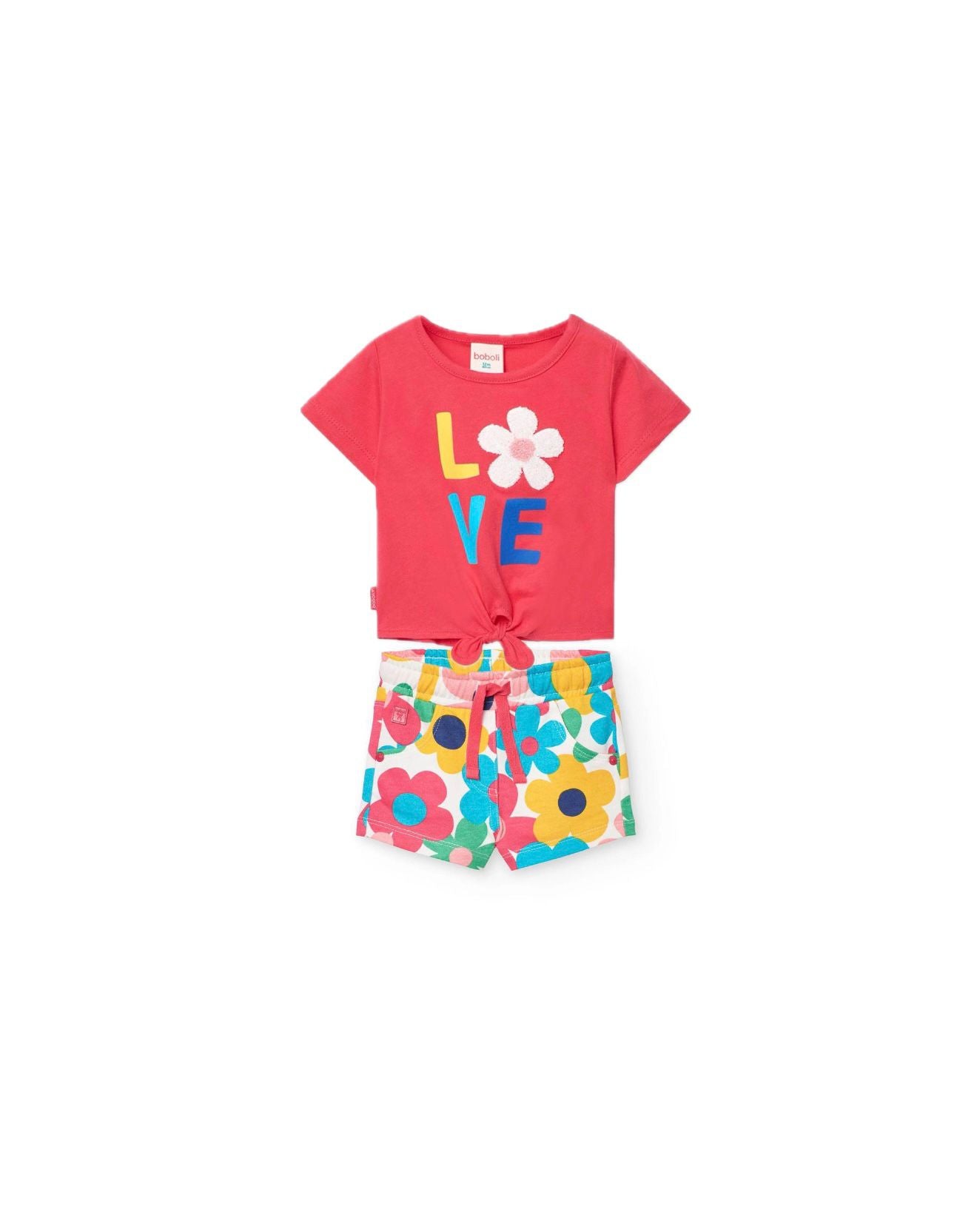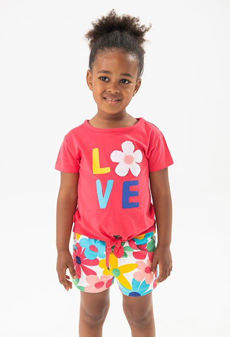 This adorable matching set features floral shorts paired with a coordinating top, complete with a stylish knotted waist and a sweet "LOVE" embroidery. The shorts are designed for comfort with an elastic waistband and handy pockets, making them perfect for everyday wear. Ideal for after-school hangouts, weekend outings, or any casual activity—this fun and comfy outfit keeps your little one stylish without sacrificing comfort.
