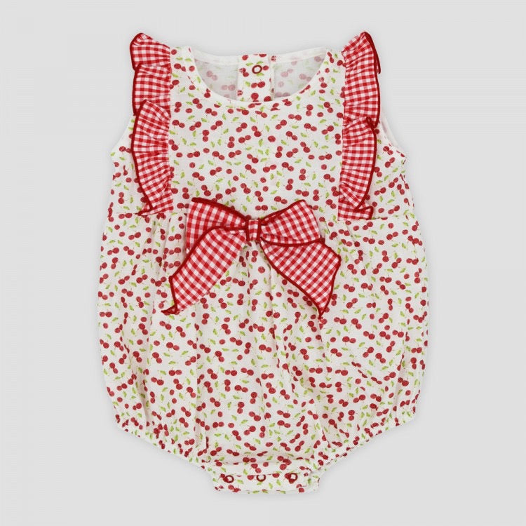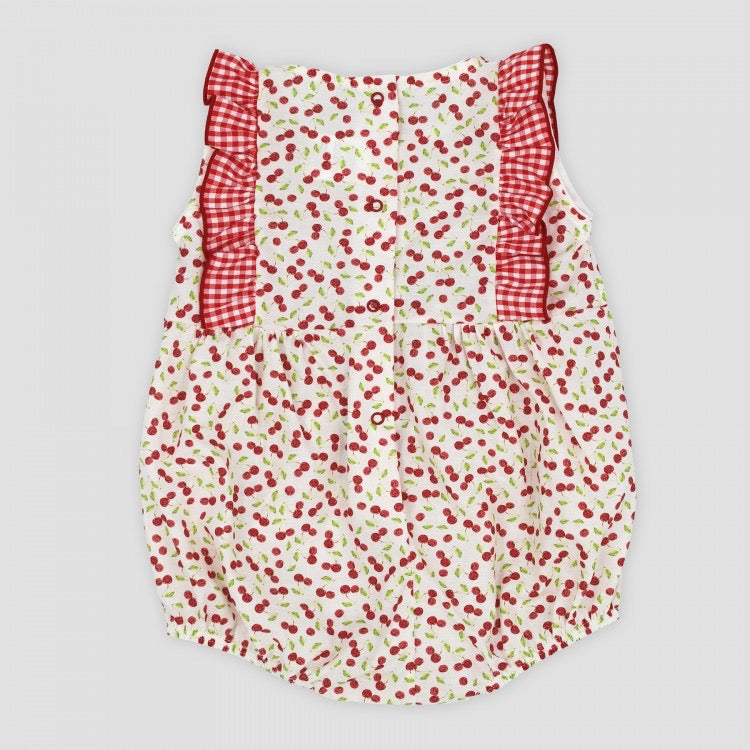 This adorable romper features a delicate cherry print on soft fabric, perfectly accented with playful red and white gingham ruffles and a matching bow. Ideal for end-of-year celebrations, photo sessions, and festive gatherings.