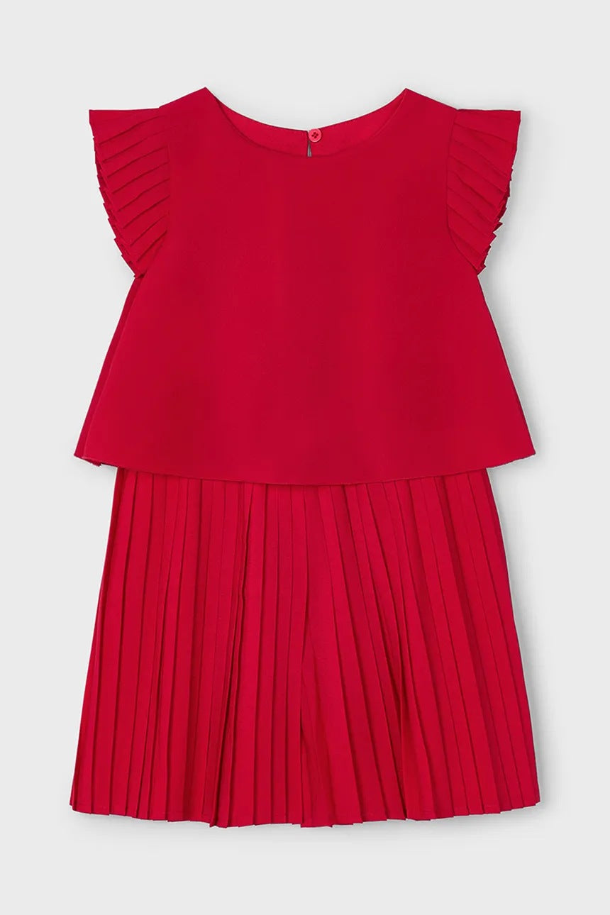 Short pleated jumpsuit that looks like a dress thanks to its elegant cut. It features a separate top for dress effect and pleated ruffle sleeves. Perfect for holiday parties — it’s stylish, elegant, and comfortable at the same time.