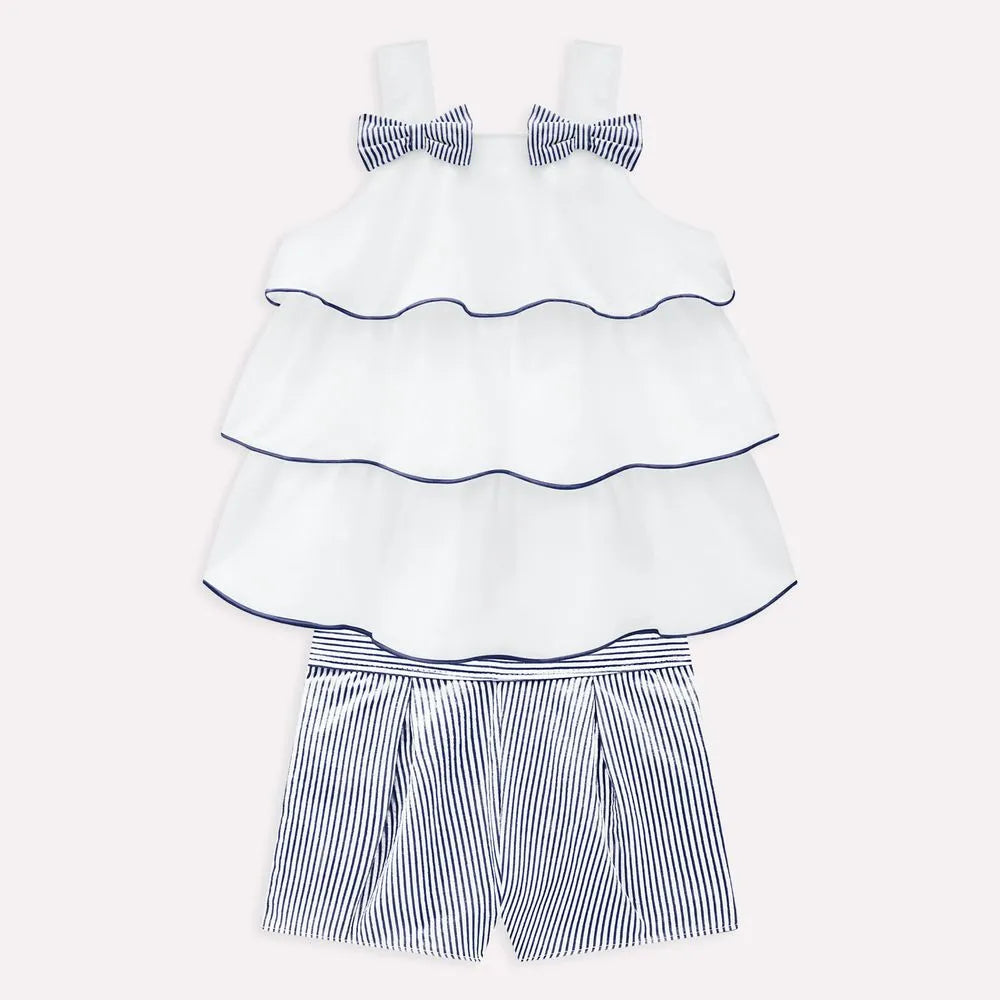 Two-piece set featuring mini-striped shorts paired with a white blouse with delicate ruffle details. Elegant, modern, and versatile, this outfit is perfect for any occasion—from casual daytime looks to more polished moments. Designed to offer comfort and effortless style, it’s an easy choice for a chic, timeless wardrobe.