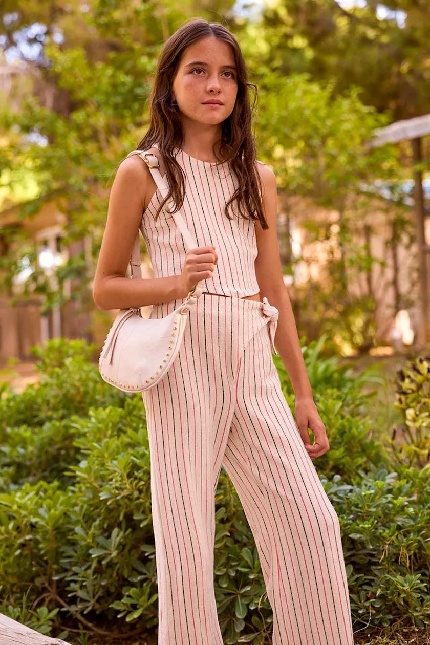 A stylish two-piece outfit featuring striped fabric pants and a waist-length blouse. This elegant set is designed especially for older girls, offering a modern and comfortable look. Perfect for special occasions, parties, family events, or dressy outings. The classic stripes combined with the flattering cropped blouse create a fashionable outfit that can be worn for many occasions.