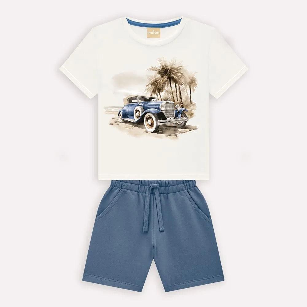 Set in cotton knit, pants in a slightly heavier knit, ideal for daily use without losing the design"The design of the vintage car fascinates the little ones.