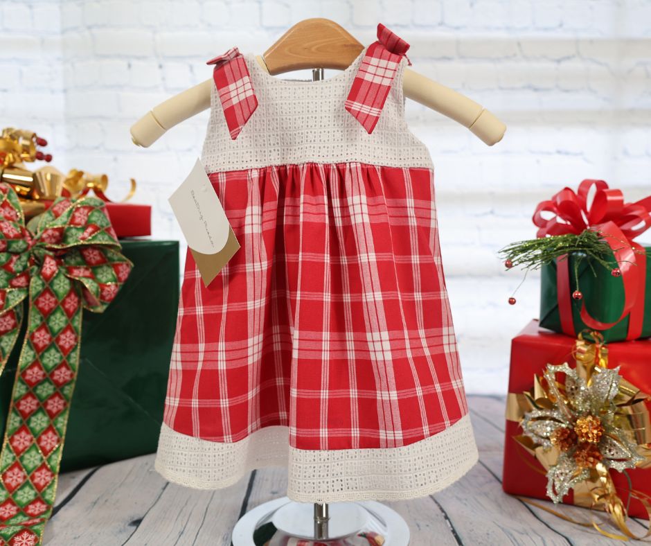 Baby dress made of soft cotton in red and white checks, featuring a white eyelet blouse and delicate bows on the shoulders. Perfect for family photos and holiday activities. Panty included.