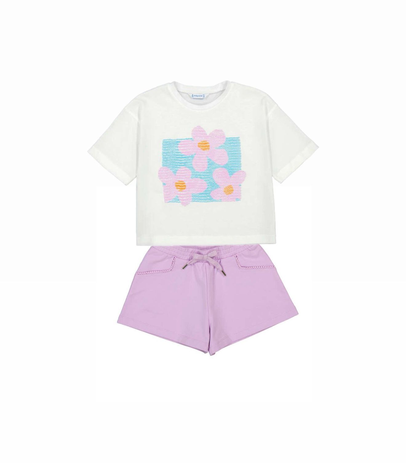 Fresh and stylish, this white top features a bold print in lilac and blue tones, perfectly paired with comfortable cotton knit shorts. Designed for all-day ease, the soft and breathable fabric makes it ideal for any occasion — whether you're relaxing at home, heading out for a casual day, or enjoying a weekend getaway.