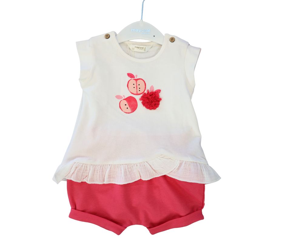 This two-piece cotton knit set features vibrant fuchsia shorts and a cute white top with apples print. Ideal for every day use.